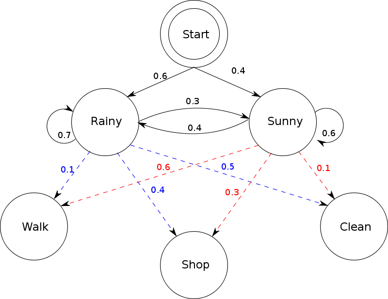 Imagine two friends, Alice and Bob. Every day, Bob engages in one of only three activities: walking, shopping, and cleaning. Bob’s choice of activity depends on the weather, which can either be rainy or sunny. Bob tells Alice about his activity, but not about the weather; hence, Bob’s activities constitute observations (made by Alice), and the weather is a hidden state. The probabilities associated with the next day’s weather given today’s weather are the elements in the transition probability matrix, and the probabilities of Bob’s activities given today’s weather form the observation model (see the figure below). For example, the red number 0.6 indicates the probability that Bob will go on a walk given that it is sunny today.