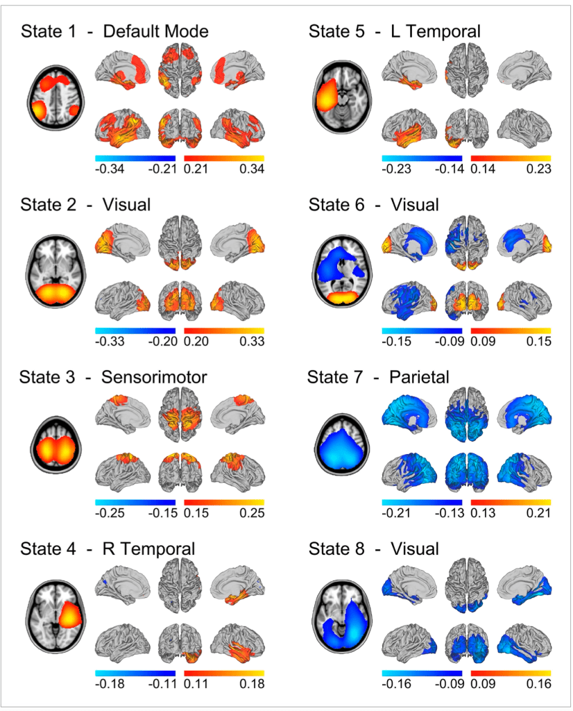 Through the HMM, resting-state MEG activity (that is, data collected while human participants were simply sitting in the MEG scanner, not performing any task) has been decomposed into eight states corresponding to eight whole-brain networks. These include the default mode network, which is responsible for a whole host of self-related cognitive processes, visual and sensorimotor networks, and more. Critically, the HMM inferred that these networks have average lifetimes of 100-200 milliseconds, which is significantly shorter than the 10-second timescales that have previously been measured for resting-state networks.