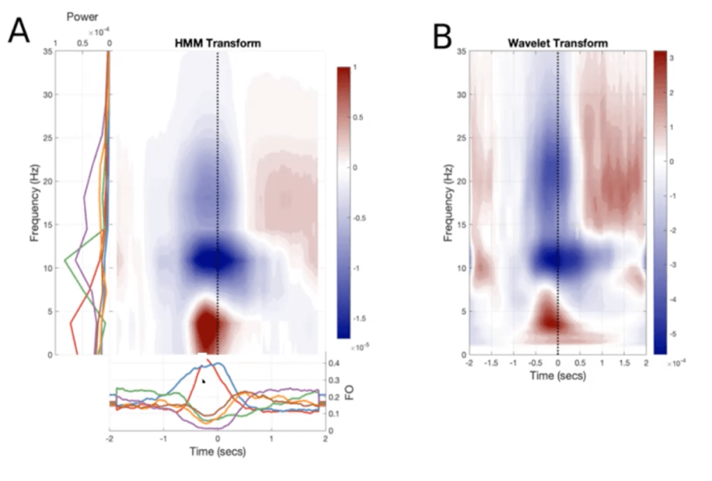 The Hidden Markov Model (HMM) for MEG, developed by Professor Mark Woolrich‘s lab at the Oxford Centre for Human Brain Activity, significantly improves on the temporal resolution of the sliding window technique. (Full disclosure: Mark Woolrich is my PhD advisor; I’ll briefly speak about my own research involving HMM later in this blogpost.) Additionally, it is “temporally unconstrained”; unlike the sliding window technique, it doesn’t implicitly specify the window of time within which MEG sensor activity ought to be measured in order to capture the underlying cognitive phenomena.