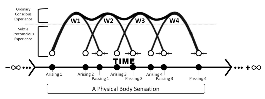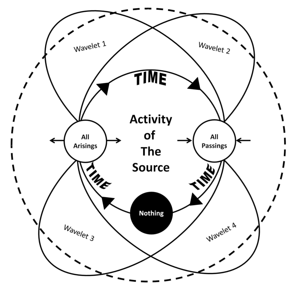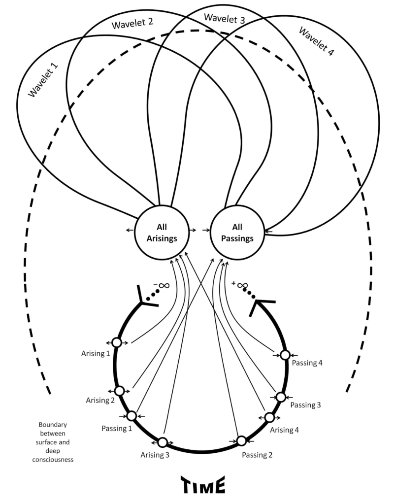 Shinzen: “The circles represent “Zero”—the Nothingness from which each wavelet arises and to which it returns. The dashed line represents the boundary between preconsciousness and consciousness experience. (Preconsciousness experience has become conscious at this stage.) W stands for wavelet.”