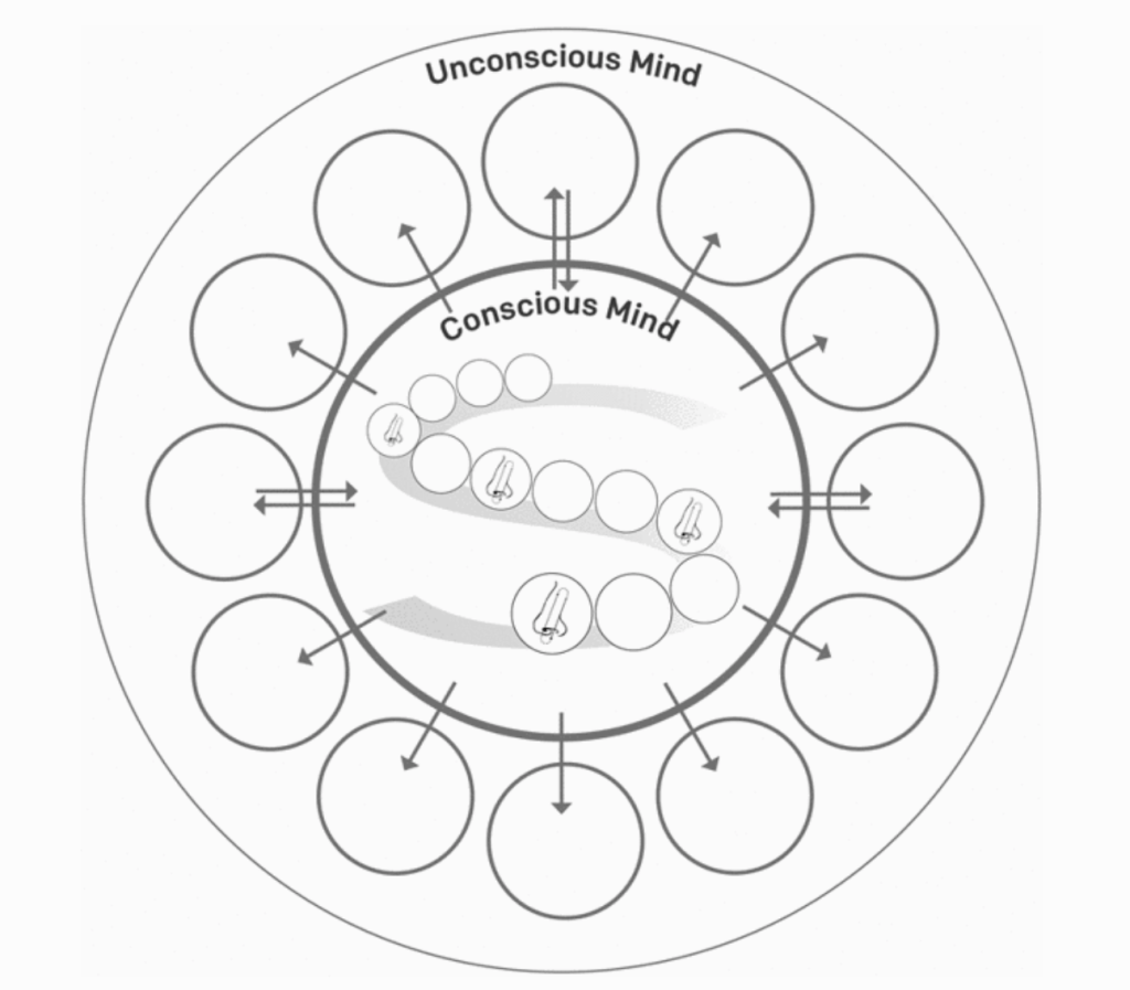 The One Nothing is metaphorically a gravitational singularity. The boundary between surface and deep consciousness (represented by the dotted line) is metaphorically the Event Horizon.”